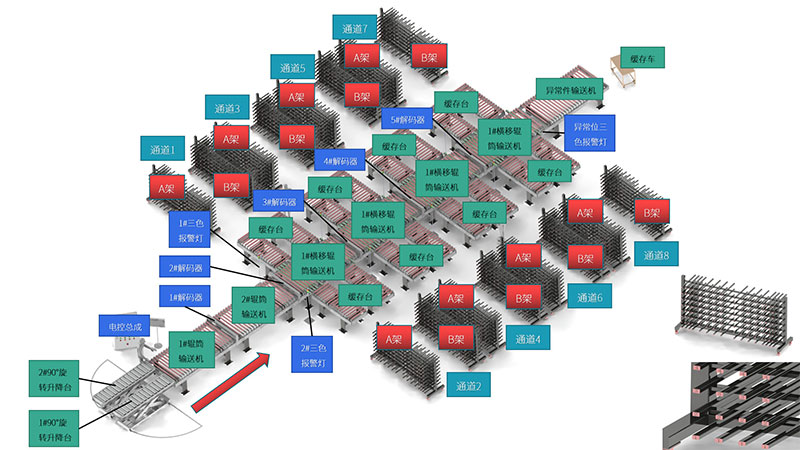 3、架(jia)子可放多(duō)個包裝箱(xiāng)的工件,一(yī)層爲一個(gè)包裝箱❄️,也(ye)可👄以兩層(ceng)爲一個包(bāo)裝箱(如果(guǒ)采用兩層(céng)爲一個包(bao)裝✉️箱,大小(xiǎo)闆分别存(cun)放,以便于(yú)包裝堆垛(duo)時選取大(dà)小闆的方(fang)便),當存架(jia)放滿工件(jiàn)時,該分揀(jian)位的三色(sè)報警燈三(sān)色長亮,表(biao)示可以出(chu)貨,即提示(shì)車間搬🌈運(yùn)工把該緩(huǎn)存架運到(dao)包裝區上(shàng)并把🏃空的(de)緩存架運(yùn)回到該位(wei)。