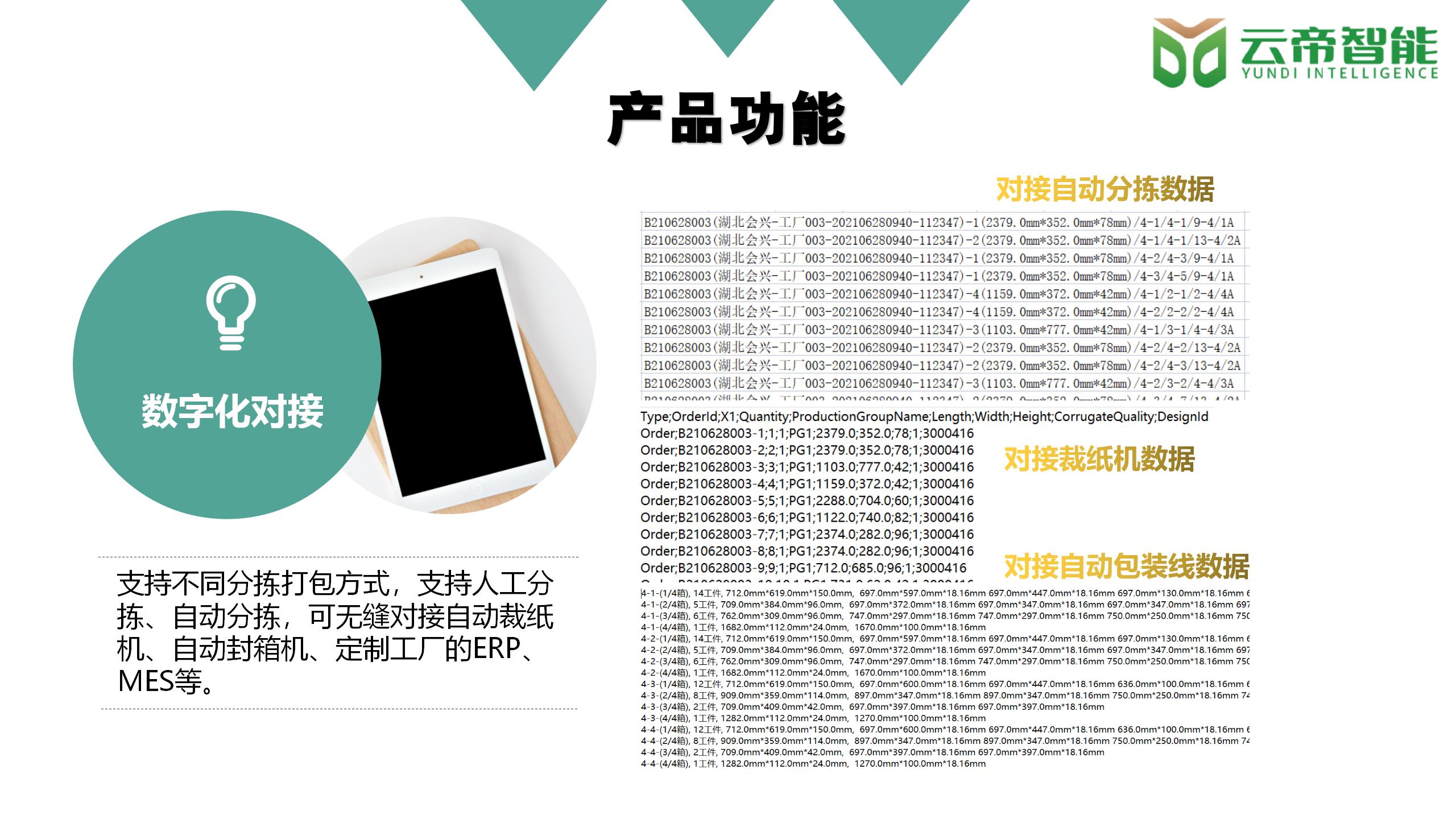 * 支持不(bu)同分揀打(dǎ)包方式,支(zhī)持人工分(fen)揀、自動分(fèn)揀,可無縫(féng)對接自動(dong)裁紙機、自(zi)動封箱機(jī)、定制工廠(chǎng)的ERP、MES等。